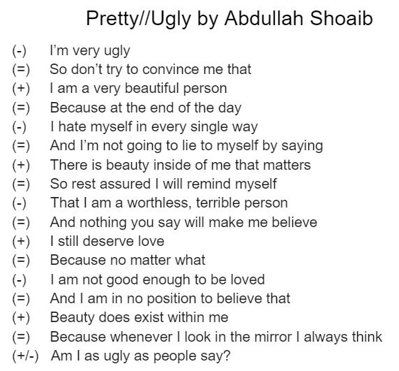 I’m going to use the poem “Pretty Ugly”, by Abdullah Shoaib as a model for how to think about the structure of your reverse poem.